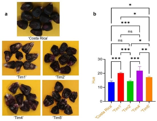 Objective colour measurement of mature kernels: (a) mature round kernels of ‘Costa Rica’ and F3 purple shrunken kernels (‘Tim1’, ‘Tim2’, ‘Tim4’ and ‘Tim5’); (b) comparative analysis of hue values of mature kernels of ‘Costa Rica’ and mature F3 shrunken kernels. Multiple comparison indicating ns = non-significant, * = significant at p < 0.05, ** = significant at p < 0.01 and *** = significant at p < 0.001.