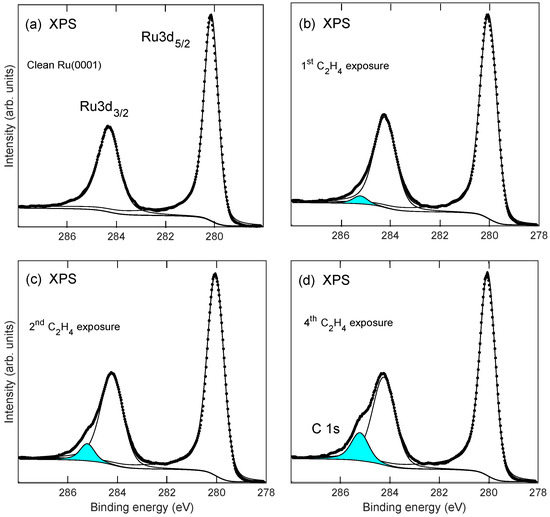 Ru3d, Ru3d, and C1s XPS after multiple ethylene exposure cycles to Ru(0001): Panels (a–d) show spectra recorded for clean Ru(0001) and after first, second, and fourth exposure cycle, respectively (see text). Solid lines show deconvoluted spectra. The filled peak near-binding energy 285.2 eV in each panel is identified as C 1s emission. The electron emission angle with respect to the surface normal was set at 70° to enhance the surface sensitivity.