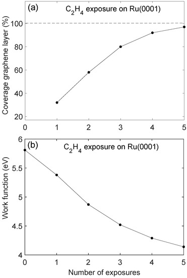 Figure 2 shows XPS data from Ru3d, Ru3d, and C1s core levels for clean Ru(0001) and after multiple ethylene exposure and annealing cycles. The spectra were deconvoluted using the Doniach–Sunjic function [41] which was convoluted by a Gaussian line shape. A Shirley-type background was used which is proportional with the integrated intensity of the core level peak as measured from the low binding energy side of the peak. By deconvoluting the XPS spectra it was possible to extract the C1s emission peak at binding energy near 285.2 eV. It has previously been shown by high-resolution spectra using soft X-ray synchrotron radiation that the C1s emission may be deconvoluted into two components [28,31]. In the present experiments, the resolution and sensitivity were insufficient to resolve these components, and thus, one average component was used for the deconvolution. The peak position of the C1s component thus represents an average over two unresolved components. The deconvoluted spectra were used to estimate the relative peak intensities using core level sensitivity data relevant for the Scienta spectrometer [42]. The XPS data was recorded at an electron exit angle of about 70° with respect to the surface normal to enhance surface sensitivity by a factor of cos(70°). Estimated effective graphene layer coverage as a function of number of ethylene exposure cycles is shown in Figure 3a. After four exposure cycles, the graphene layer thickness seems to be near saturation. The saturated graphene coverage is taken to be one monolayer [28,31]. It was found that the thickness of the graphene layer was over-estimated when determined from XPS intensities. This may partly be due to inaccuracy in determine core level intensities due to the overlap of the C1s and Ru3d levels, and partly due to the possible presence of electron diffraction effects when recording photoelectron intensities at the 70° angle with respect to the surface normal. In Figure 3b the measured work function is shown after each exposure cycle. The measured work function for Ru(0001) is near 5.8 eV and is lowered to near 4.2 eV after five exposure and annealing cycles. The work function value was found to saturate at about 4.0 eV after nine ethylene exposure and annealing cycles. This work function value is lower than that of graphite of about 4.7 eV [43]. As previously reported [35], the lowering of the work function as compared with the value for Ru(0001) as well as graphite indicates strong substrate bonding and significant charge transfer from the metal to the graphene layer.