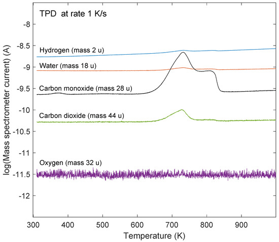 where n is the surface coverage (number of atoms per unit volume), is the desorption prefactor, k is the order of the desorption, is the desorption energy, and T is the temperature. In general the desorption process is made complicated by desorption from lattice sites of different adsorption energies, and by that both the prefactor and desorption energy in general depend on the surface coverage as well as lateral interactions between adsorbates [47]. First-order desorption describes desorption of adsorbed molecules, and second-order desorption describes recombinative desorption, for example, C and O atoms recombine and desorb as CO. Even noninteger orders of desorption may occur due to strong lateral interactions, multiple adsorption sites, and nonrandom adsorption sites. The present case where carbon and oxygen atoms recombine to desorb as CO and to a lesser extent as CO would be a candidate for second-order desorption.