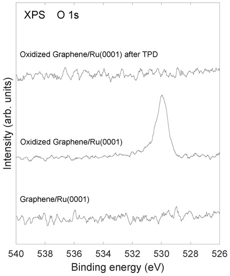 XPS spectra recorded after annealing to 1000 K are shown in Figure 7. It is observed that the C1s emission still remains after annealing, in agreement with the LEED results in Figure 1d which also shows that graphene is still present after annealing. Figure 7 shows C1s and Ru3d XPS after formation of graphene and after annealing to 1000 K of the oxidized samples, respectively. In Figure 7a,b are shown results in the case of 2 ethylene exposure cycles, and Figure 7c,d show similar spectra for 4 ethylene exposure cycles. The estimated thickness of the graphene layer is reduced by about 38% and 48% after annealing to 1000 K of the oxidized samples in the case of 2 and 4 ethylene exposure cycles, respectively. Figure 8 shows the absence of O1s emission in the XPS after annealing to 1000 K in agreement with previous results [14], where it was found that oxidation of the graphene on Ru system only takes place at elevated temperatures above 600 K. The graphene layer is stable at temperatures at least up to 1250 K (as investigated in this study) in the absence of oxygen atoms at the interface. For graphene on a Ru system that had been oxidized at 675 K, the situation is different; the carbon atoms from the graphene layer react with oxygen atoms at the Ru surface and desorb as CO and CO. When all the oxygen atoms have reacted with carbon atoms and desorbed, an incomplete graphene layer is left on the Ru surface.