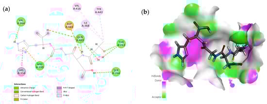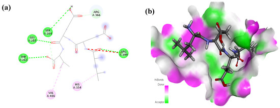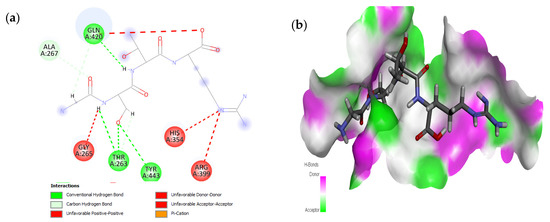 The active site residues (i.e., Arg366, Arg399, Gln420, Gln421, Asp444, and Gln446) were selected on the basis of previously reported studies [22]. A total 100 antimicrobial tetrapeptides were docked to the receptor protein (capsid protein) of HEV. The binding pattern and S-scores of protein–ligand docking screened out the top ten hits as potent inhibitors of the capsid protein of HEV by integrating with active site residues. Capsid protein protects the virion and mediates the attachment to the host cell. Therefore, capsid protein could be the most appropriate target to hinder HEV infection [4]. All the best selected peptides in this study exhibited strong interactions with active site residues of the catalytic site of the capsid protein as a receptor (Table 1). In the current study, the peptide GSTR with S-score of −10.1 showed interactions with Thr263, Gln420, and Tyr443 residues of the binding pocket (Figure 1).