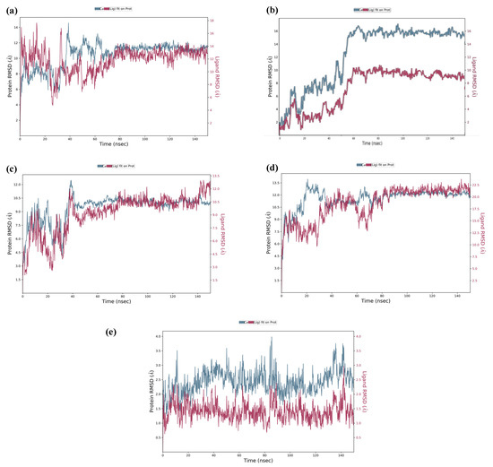 Molecular simulation RMSD trajectories with respect to time. The MD simulation was done for 150 ns at 310 K temperature, 1.00314 bar pressure, 1000 frames, and 7.4 pH). The MD simulation of the docked complex of GSTR–capsid protein (a); TDGH–capsid protein (b); LEEV–capsid protein (c); WDDG–capsid protein (d); EGDE–capsid protein (e). The left Y-axis shows the variation of protein RMSD through time. The right Y-axis shows the variation of ligand RMSD through time.