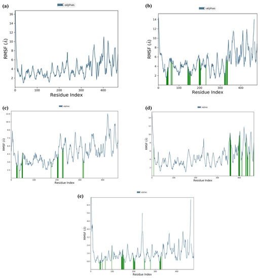 Residue wise Root Mean Square Fluctuation (RMSF) of protein–ligand complexes during 150 ns. (a) capsid protein with GSTR peptide; (b) capsid protein with TDGH peptide; (c) capsid protein with LEEV peptide; (d) capsid protein with WDDG peptide; (e) capsid protein with EGDE peptide. The RMSF of docked protein showed no fluctuation of interacting residues, where green vertical lines are representing interacting residues.