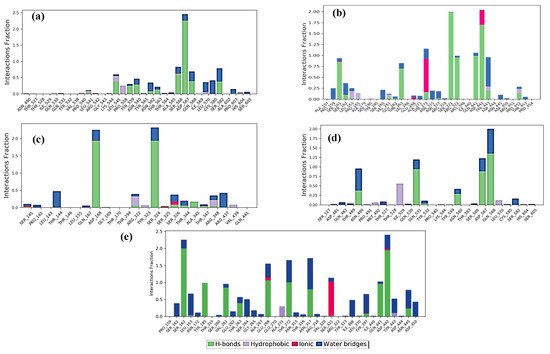 Protein–ligand contact histogram. Protein structures complexed with (a) GSTR peptide; (b) TDGH peptide; (c) LEEV peptide; (d) WDDG peptide; (e) EGDE peptide.