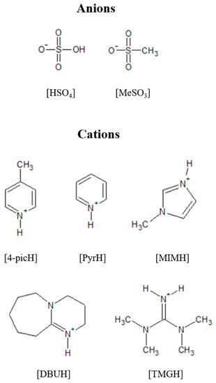 All reagents for the synthesis of the PILs were purchased and used without additional purification. The list of reagents is the following: 4-methylpyridine 98%, methylimidazole 99% and tetramethylguanidine 99% from Alfa Aesar (Tewksbury, MA, USA); pyridine p.a. and sulfuric acid 95–97% from Merk (Rahway, NJ, USA); 1,8-diazabicyclo(5.4.0)undec-7-ene 98% and methanesulfonic acid 99% from Sigma-Aldrich (Rahway, NJ, USA).