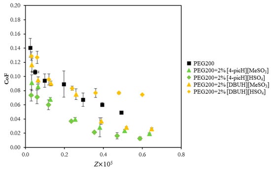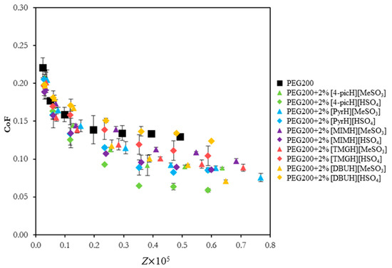 CoF vs. Sommerfeld parameter, , for the pair SS sphere/Si substrate using neat PEG200 and the mixtures PEG200 + 2% PIL as lubricants. The errors are ±standard deviation (n ≥ 3).