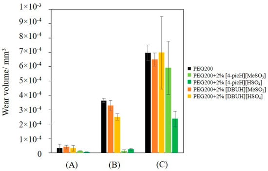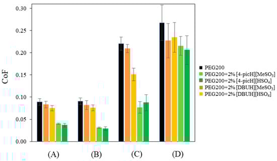 The choice of the optimal concentration of the PIL was based on the comparison of the CoF obtained with mixtures of [4-picH][HSO4] and PEG200 using three concentrations: 1%, 2% and 5% (w/w) (Figure S1). The CoF decreased when the IL concentration increased from 1% to 2% and then increased to 5%. A possible explanation is that the concentration of 1% was not enough to ensure the formation of a protective lubrication film, while 5% led to a rougher film. Thus, a concentration of 2% was adopted for all PILs.