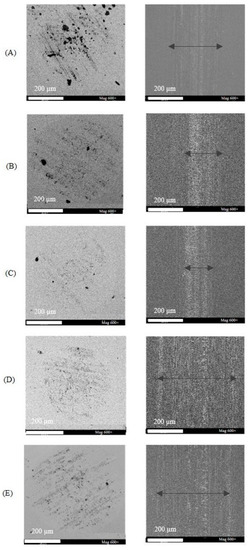 FEG-SEM images with 600 amplification of the worn surfaces of the Si balls and the Si substrates after long tribological tests under the load of 4 N using as lubricants: PEG200 (A), PEG200 + 2% [4-picH][MeSO3] (B), PEG200 + 2% [4-picH][HSO4] (C), PEG200 + 2% [DBUH][MeSO3] (D) and PEG200 + 2% [DBUH][HSO4] (E). The black arrows mark the limits of the wear tracks.