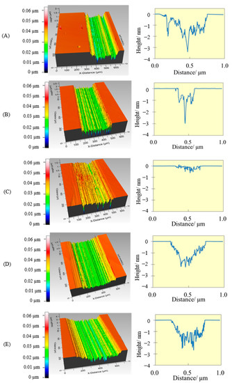 Wear tracks of the Si substrates (profilometer images with 20 amplification) after long tribological tests under the load of 4 N using as lubricants: PEG200 (A), PEG200 + 2% [4-picH][MeSO3] (B), PEG200 + 2% [4-picH][HSO4] (C), PEG200 + 2% [DBUH][MeSO3] (D) and PEG200 + 2% [DBUH][HSO4] (E).