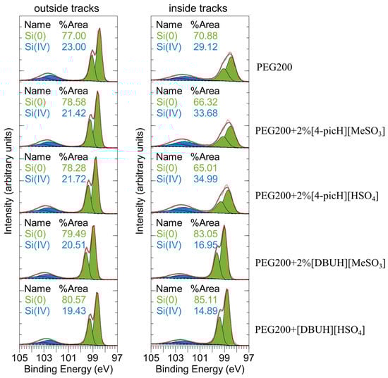 The XPS spectra of the Si substrates inside the wear tracks (regions limited by the segments between arrows in Figure 6) are compared with the ones outside the wear tracks, in Figure 8. The relative amount of Si4+ compared to Si0 provides an indication for surface oxidation of the silicon. The quantification was conducted via fitting over a Shirley background, using Si 2p duplets with a line shape of LA (1.5,3,90) for Si0 and GL(30) for Si4+. The Si substrates outside the wear tracks all have a similar Si4+ contribution. After application of the load, the presence of oxidized silicon is most pronounced with the lubricants containing [4-picH]. This strongly indicates the wear-induced formation of silicon dioxide, which offers additional protection against wear. In fact, the Young modulus of SiO2 (66–75 MPa) is much smaller than that of Si (130–169 MPa), which makes the oxidized silicon easier to deform. Note, that the superior resistance to wear not only depends on the surface oxidation by the cation [4-picH] but also on the right anion: the combination [4-picH][HSO4] allows for better protection of the sliding surfaces, which may be related to its higher chemical adsorption.