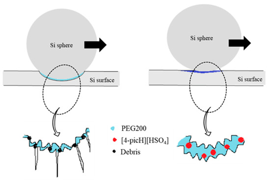 A schematic representation of the possible lubrication process during the tribological tests under high load with PEG200 and the mixture PEG200 + 2% [4-picH][HSO4] is proposed in Figure 9. The three-body abrasive wear leads to the formation of debris and surface cracks, which occurs when the lubricant PEG200 is minimized in the presence of the mixture. The PIL adsorbs to the sliding surfaces avoiding direct contact between the body and counterbody which becomes slightly deformed under the load.