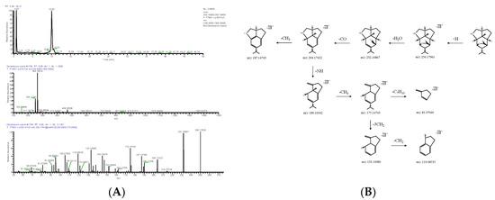 Extracted ion chromatogram: MS1 and MS2 spectra in positive ion mode (A), and proposed main fragments of dendrobine (DN 10) (B).