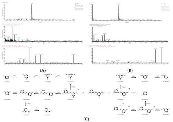 Extracted ion chromatogram: MS1 and MS2 spectra in positive ion mode (A) and negative ion mode (B), and proposed main fragments of ephemeranthol B (DN 30) (C).
