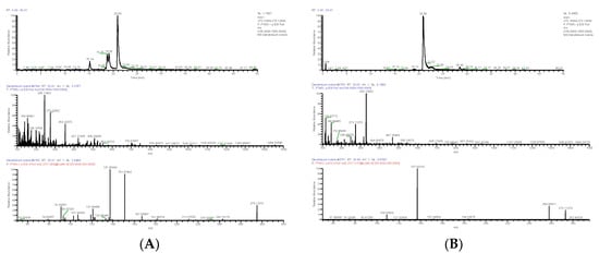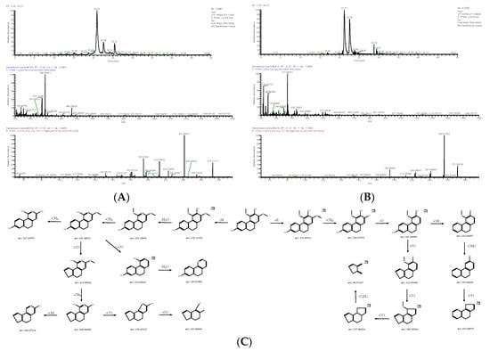 Extracted ion chromatogram: MS1 and MS2 spectra in positive ion mode (A) and negative ion mode (B), and proposed main fragments of batatasin III (DN 26) (C).