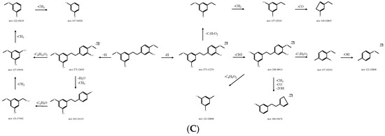 There were five bibenzyls identified from DNE. The molecular formula of DN 26 was calculated to be C15H16O3, and its positive quasi-molecular ion m/z 245.11673 (ppm −2.003) [M+H]+ was fragmented into fragment ions m/z 151.07495 [M+H-C6H6O]+ and m/z 227.10631 [M+H-H2O]+. The fragment ion m/z 151.07495 successively discarded -CH2, -CHO, and -CH2, and fragment ions m/z 137.05936 [M+H-C7H8O]+, m/z 107.04925 [M+H-C8H9O2]+ and m/z 79.05473 [M+H-C9H11O2]+ were generated in turn. The fragment ion m/z 227.10631 could drop -CH2 to produce m/z 213.09059 [M+H-CH4O]+, and the latter further lost -C7H6O and -C6H4O to obtain m/z 107.04925 [M+H-C8H10O2]+ and m/z 121.06474 [M+H-C7H8O2]+; m/z 103.05436 [M+H-C7H10O3]+ was derived from m/z 121.06474 by the cleavage of -H2O. The negative quasi-molecular ion m/z 243.10201 (ppm 1.806) [M-H]− was fragmented into fragment ions m/z 93.03316 [M-H-C9H10O2]−, m/z 151.03877 [M-H-C6H4O]− and m/z 227.07059 [M-H-OH]−; m/z 137.02272 [M-H-C7H6O]− as a fragment ion was produced by the loss of -CH2 from m/z 151.03877 (Figure 4), and the latter was further cleaved -CHO to obtain m/z 108.02022 [M-H-C8H7O2]−; m/z 213.05479 [M-H-CH3O]− was derived from m/z 227.07059 by the cleavage of -CH2, and the latter was further cleaved -C6H4O to obtain m/z 121.02811 [M-H-C7H7O2]−. DN 26 was finally confirmed as batatasin III (C15H16O3). The molecular formula of DN 29 was C16H18O4, and its positive quasi-molecular ion m/z 275.12692 (ppm −3.146) [M+H]+ was fragmented into fragment ions m/z 137.05934 [M+H-C8H10O2]+ and m/z 243.10115 [M+H-CH5O]+. The fragment ion m/z 243.10115 successively discarded -C6H5O, -CH2, -CH3, and -CH3, and fragment ions m/z 151.07492 [M+H-C7H10O2]+, m/z 137.05943 [M+H-C8H12O2]+, m/z 122.03619 [M+H-C9H15O2]+ and m/z 107.04920 [M+H-C10H18O2]+ were generated in turn. The negative quasi-molecular ion m/z 273.11270 (ppm −2.819) [M-H]− was fragmented into fragment ions m/z 137.02310 [M-H-C8H9O2]− and m/z 258.08911 [M-H-CH3]−; m/z 109.02803 [M-H-C9H9O3]− as a fragment ion was produced by the loss of -CO from m/z 137.02310 (Figure 5); the fragment ion m/z 258.08911 could respectively drop -C8H9O2, (-CH3, -CO and -2OH), and -C7H5O2 to produce m/z 121.02808 [M-H-C9H12O2]−, m/z 184.03676 [M-H-C3H7O3]− and m/z 137.02310 [M-H-C8H8O2]−, and the latter further lost -OH to obtain m/z 121.02808. DN 29 was finally inferred as gigantol (C16H18O4).