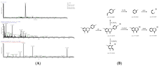 Extracted ion chromatogram: MS1 and MS2 spectra in negative ion mode (A), and proposed main fragments of naringenin (DN 23) (B).