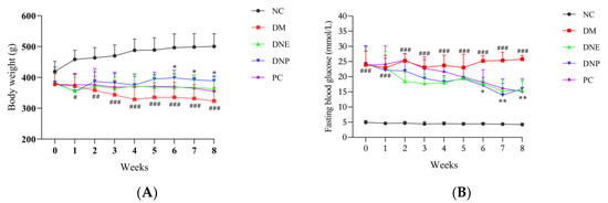 Effects of D. nobile on body weight (A) and FBG (B) of T2DM rats. All data are expressed as mean ± S.D. (n = 6 per group). Compared with the NC group, # p < 0.05, ## p < 0.01, and ### p < 0.001; compared with the DM group, * p < 0.05 and ** p < 0.01.
