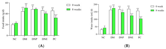 Effects of D. nobile on food intake (A) and water intake (B) of T2DM rats. All data are expressed as mean ± S.D. (n = 6 per group). Compared with the NC group, ### p < 0.001; compared with the DM group, * p < 0.05 and *** p < 0.001.