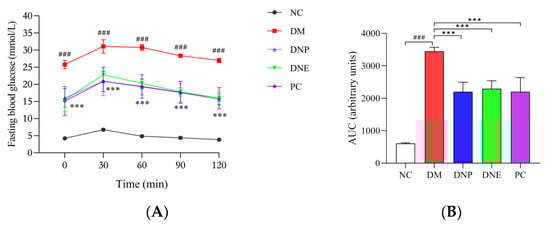 Effect of D. nobile on oral glucose tolerance of T2DM rats: blood glucose levels (A) and their AUCs (B). All data are expressed as mean ± S.D. (n = 6 per group). Compared with the NC group, ### p < 0.001; compared with the DM group, *** p < 0.001.