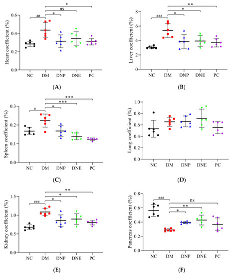 Effects of D. nobile on organ coefficients ((A): heart, (B): liver, (C): spleen, (D): lung, (E): kidney and (F): pancreas) of T2DM rats. All data are expressed as mean ± S.D. (n = 6 per group). Compared with the NC group, # p < 0.05, ## p < 0.01, and ### p < 0.001; compared with the DM group, * p < 0.05, ** p < 0.01, and *** p < 0.001.