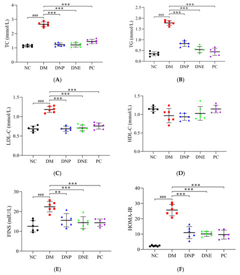 D. nobile could regulate blood lipid profile, reduce insulin levels and increase liver glycogen synthesis in T2DM rats. The serum levels of TC, TG, LDL-C, FINS and HOMA-IR in the DM group increased significantly compared to those of the NC group (Table 3), while liver glycogen content was significantly decreased (p < 0.001). The TC, TG, LDL-C, FINS and HOMA-IR levels of the DNE and DNP groups were all significantly reduced (p < 0.001) compared to those of the DM group; liver glycogen contents under the treatment of DNE and DNP were significantly increased (p < 0.001); and there were no changes in the HDL-C levels between these groups (Figure 13). Therefore, these results suggested that D. nobile ameliorated hyperlipidemia and insulin resistance in T2DM rats, and it reduced blood glucose concentration by increasing liver glycogen storage.