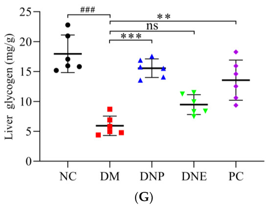 The H&E-stained features of normal rat hepatic tissue generally contained regular-shaped hepatic lobules, radial distribution of hepatic cords and hepatic sinusoids around the central vein, polygonal and intact hepatocyte morphology, orderly arranged hepatocytes, and circular hepatocyte nuclei. The T2DM rats in the DM group had disordered hepatic cords, irregular arrangement of hepatocytes with steatosis, distorted and narrow hepatic sinusoids, and infiltration of inflammatory cells around the central vein (Figure 14), showing the liver tissue was seriously disordered with fat infiltration and accumulation. In the DNE and DNP groups, the morphology of hepatic lobules and hepatocytes was basically restored to normal, and hepatic cords and hepatic sinusoids were significant, but there was only a little fat deposition and inflammatory cell infiltration. The PC group also showed a similar effect, and there was no apparent inflammatory cell infiltration.