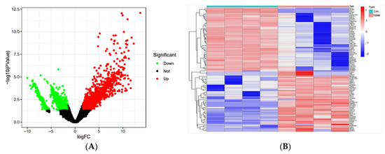 The volcano map (A) and heat map (B) of DEGs in T2DM patients. Red represents up-regulated genes, green represents down-regulated genes, and black represents unchanged genes.