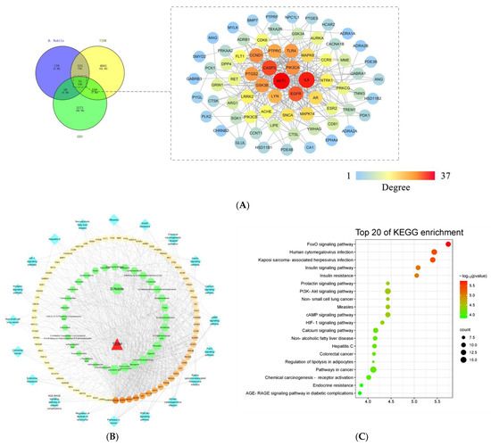 PPI network (A), “Herb-Compounds-Targets-Pathway-Disease” network (B), and bubble diagram of the KEGG enrichment analysis (C) of D. nobile in the treatment of T2DM after the network pharmacological analysis.