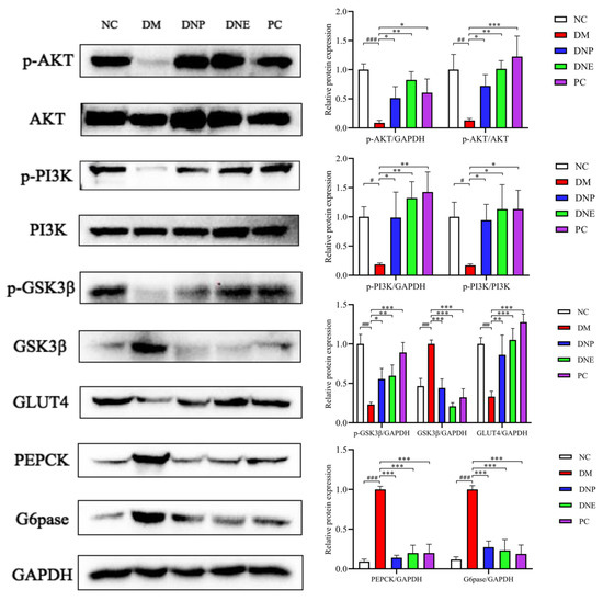 Effects of D. nobile on the expression of P-PI3K, P-PI3K/PI3K, P-Akt, P-Akt/Akt, PEPCK, G6Pase, p-GSK3β, GSK3β and GLUT4 proteins in the liver of T2DM rats. Compared with the NC group, # p < 0.001, ## p < 0.001, and ### p < 0.001; compared with the DM group, * p < 0.01, ** p < 0.01, and *** p < 0.001.