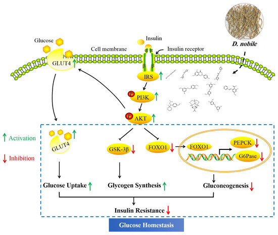 Almost all core targets of D. nobile were involved in the PI3K/AKT signaling pathway, the insulin signaling pathway, the FOXO signaling pathway and insulin resistance. AKT1, PIK3CA, GSK3B and EGFR might play an important role in the biological process of D. nobile, thereby intervening in type 2 diabetes. AKT1 is a serine/threonine protein kinase that improves β-cell function and glucose homeostasis [27]. PI3K family has also been confirmed to be involved in glucose regulation in the occurrence and development of diabetes. The activation of PI3K can induce insulin-related regulatory factors to regulate glucose metabolism. The PI3CA gene is responsible for coding the catalytic subunit of PI3K, and biological function of PI3CA involves regulating immunity, inflammatory process and the development of diabetes [28]. The inhibition of EGFR can delay the occurrence and development of diabetes and its complications, and EGFR has been reported to help the improvement of heart damage and remodeling by reducing oxidative stress in STZ-induced diabetic mice [29]. Insulin resistance is a crucial factor in the occurrence of T2DM, and its pathological state involves abnormalities in the insulin signaling pathway. When insulin binds to insulin receptors, insulin signal is transmitted from extracellular domain to intracellular domain to activate insulin receptor, and activated insulin receptor can be combined with insulin receptor substrate (IRS), thus activating the downstream PI3K/AKT pathway [30]. The PI3K/Akt signal pathway is one of the main signal transduction pathways that affects insulin and plays an important role in regulating glucose metabolism [31], including glycogen synthesis, promotion of glucose uptake and inhibition of hepatic gluconeogenesis in the liver. However, these liver processes are dysfunctional in T2DM as the liver becomes insulin resistant. The results showed that D. nobile might activate the insulin signaling pathway by up-regulating the protein expression levels of p-PI3K, p-PI3K/PI3K, p-AKT and p-AKT/AKT in diabetic rats, thereby improving the glucose metabolism disorder (Figure 19). It is well known that GSK3β, GLUT4 and FOXO1 are the key proteins regulated by phosphorylated AKT, and GSK3β plays an important role in regulating glycogen synthesis as a key negative regulator pathway of insulin signaling [32]. In this regard, D. nobile increased p-GSK3b levels and decreased GSK3B values, thereby regulating glucose metabolism by affecting glycogen synthesis. GLUT4 is a major insulin-reactive glucose transporter, which plays a key role in regulating whole-body glucose homeostasis. When carbohydrates are ingested, insulin activates the signaling cascade to stimulate GLUT4, which rapidly translocates to the plasma membrane, thereby promoting tissue uptake and utilization of glucose [33]. D. nobile promoted GLUT4 translocation and stimulated glucose uptake. On the other hand, PEPCK and G6Pase are rate-limiting enzymes that control liver gluconeogenesis and play an irreversible role in the gluconeogenesis pathway as the regulatory factors downstream of FOXO1 [34]. D. nobile can reduce liver gluconeogenesis by down-regulating the protein levels of PEPCK and G6Pase in T2DM rats, improve raw glucose level and glucose uptake, and relieve insulin resistance by restoring the insulin signaling pathway. However, further studies are needed to explore the relationship between the PI3K/Akt signaling pathway and glucose metabolism-related proteins.
