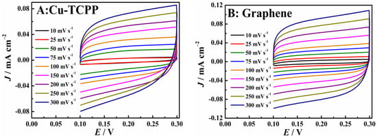 Then, the electric double-layer capacitance (Cdl) of the obtained materials was calculated to further compare the electrochemical active area. According to the reported experimental results [30], the exposed copper active sites in Cu-TCPP exit some redox waves in the region of 0.1 to −0.6 V. Therefore, the CV curves in a non-Faradaic region (e.g., from 0.10 to 0.30 V) were recorded under different scan rates (Figure 4A–C). The Cdl of Cu-TCPP, graphene, and Cu-TCPP/graphene was obtained to be 0.450 mF cm−2, 0.568 mF cm−2, and 0.768 mF cm−2 based on the slope of the linear equations between the scan rates and the capacitive currents (∆J) at 0.20 V (Figure 4D) [31,32,33]. The large Cdl also represents a large electrochemical active area. Clearly, the Cu-TCPP/graphene composite owns the largest active area. The results are consistent with the above results. In general, the Cu-TCPP/graphene composite owns excellent electrochemical properties and is suitable for the construction of the electrochemical sensing platform.