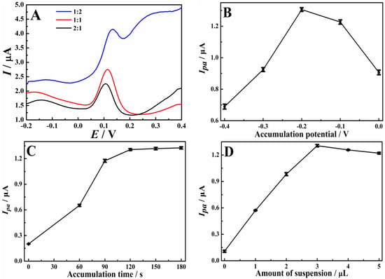 Before testing, the experimental conditions were firstly optimized, including the volume ratio of Cu-TCPP to graphene, the accumulation potential, the accumulation time, and the amount of Cu-TCPP/graphene suspension. As shown in Figure 8A, when the volume ratio of Cu-TCPP and graphene is 1:1, the oxidation peak current is the largest. Therefore, equal volumes of Cu-TCPP suspension and graphene suspension were mixed to prepare the Cu-TCPP/graphene composite. Then, the effect of accumulation potential on the oxidation current of DA was discussed (Figure 8B). The increased signals are detected when increasing the potential from −0.4 to −0.2 V. However, when the accumulation potential is further increased to 0 V, the signals start to decrease. This may be a result from the oxidation of DA during the accumulation process at the higher potential. Figure 8C describes the influence of accumulation time on the determination of DA. When the accumulation times are lengthened from 0 to 2 min, the oxidation signals of DA are increased obviously. However, further extending the time to 3 min, slight enhancement is found, indicating the surface reaches a saturation status. In the end, the optimal modification amount of Cu-TCPP/graphene suspension was studied (Figure 8D). A remarkable increase in the oxidation signal of DA is noticed with the volume of modification from 0 to 3 μL, and then it decreased slightly. This may be because of the enhanced accumulation ability resulting from the modification of the Cu-TCPP/graphene composite. To sum up, the best test conditions are as follows: (a) pH value of buffer solution: 7.0, (b) materials mixing volume ratio: 1:1, (c) accumulation potential: −0.20 V, (d) accumulation time: 2 min, and (e) amount of modification: 3 μL.