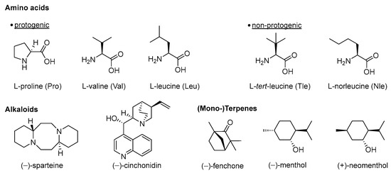- Blaser, H.U. The Chiral Pool as a Source of Enantioselective Catalysts and Auxiliaries. Chem. Rev. 1992, 92, 935–952. [Google Scholar] [CrossRef]