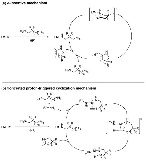 The σ-insertive (a) and concerted proton-triggered cyclization mechanism (b) for intramolecular hydroaminations [29,33,54,59,61,64,65,68,71,72].