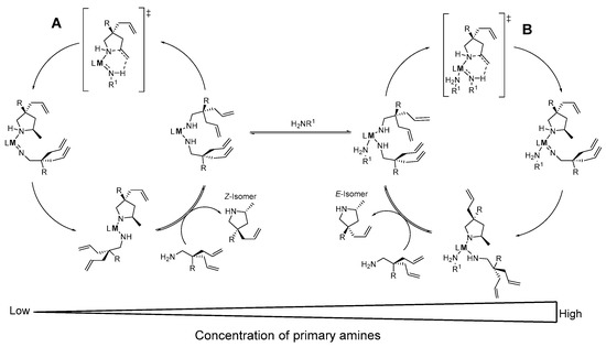 Hydroamination reactions are thermodynamically neutral [5,6,18,19]. Due to the electrostatic repulsion between the nitrogen lone pair, the C,C π-system and the orbital symmetry-forbidden [2 + 2] cycloaddition, hydroamination reactions possess a high reaction barrier despite being kinetically favored as caused by the increase in the total bonds. Therefore it is necessary to catalyze or run the respective reactions at a high temperature [5,6].