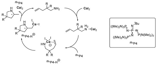 - Crimmin, M.R.; Casely, I.J.; Hill, M.S. Calcium-Mediated Intramolecular Hydroamination Catalysis. J. Am. Chem. Soc. 2005, 127, 2042–2043. [Google Scholar] [CrossRef] [PubMed]