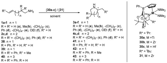 Early transition metals and rare earth metals have been extensively studied in intramolecular hydroamination catalysis [24]. The HSAB principle states that “hard metals” bind to “hard ligands”. Therefore, early metals have been combined with ligands, such as amines, alcohols and ethers. For transition metals of group IV of the periodic table of elements and rare earth metals, cyclopentadienyls have also been proven to be excellent ligands for the catalytic active center [33,53,54,55,56,57,58].