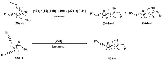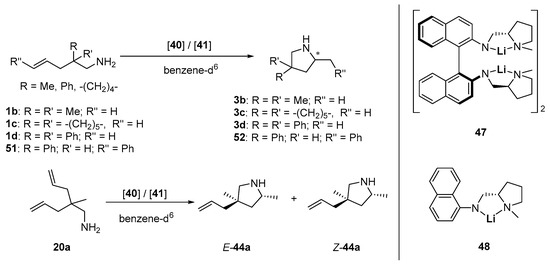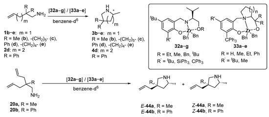 Additionally, catalysts (S)-5h and (S)-6a,b were studied in the hydroamination/cyclization of sterically hindered aminoalkenes E-7a,b and Z-8, producing pyrrolidines 9a,b and piperidine 10 with good to excellent yields and ee values as high as 68% (with (S)-6a as a catalyst (Table 2, entries 6 and 7), albeit at much harsher conditions (Table 2) [70]. Generally, the (+)-enantiomers 9a,b and 10 are formed. However, using (S)-6a as pre-catalyst for the cyclization of aminohexene Z-8 to piperidine 10, the corresponding (-)-enantiomer was obtained.