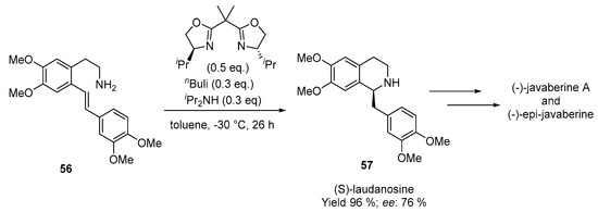 - Ogata, T.; Kimachi, T.; Yamada, K.I.; Yamamoto, Y.; Tomioka, K. Catalytic Asymmetric Synthesis of (S)-Laudanosine by Hydroamination. Heterocycles 2012, 86, 469–485. [Google Scholar] [CrossRef]