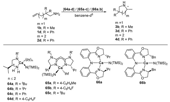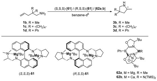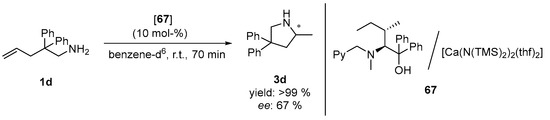 Chai et al., reported on a tridentate-linked amido–indenyl yttrium complex on the basis of 1,2-diaminocyclohexane, which transforms amino-olefins 1b–d and 2b–d into the corresponding N-heterocycles with ee values of up to 97% [89]. Those systems show a similar enantioselectivity as the 3,3′-bis(arylalkylsilyl)-substituted binaphtholate complexes towards aminoalkenes 1b–d and a higher enantioselectivity towards 2d, which increases the difference to the chiral-pool-derived catalyst even further.