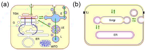 (a) Lipid organization in animal cells (G for Golgi, TGN for trans Golgi network, MITO for mitochondria) [19]. The glycerophospholipids are denoted by the gray color, sphingomyelin by the red color, and cardiolipids by the blue color. (b) Lipid sorting by lateral segregation [19].