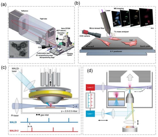 (a) Schematic of the NDPI–TOFMS system [28]. (b) Schematic of the micro–lensed fiber LDI-MS system [29]. (c) Schematics of MALDI–2–MSI [30]. (d) Schematics of t–MALDI–2–MSI [22].