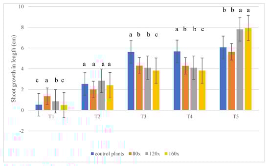 The most significant differences in shoot growth of studied plants were visible on T3 (30 days after the experiment started) and T4 (56 days). The most intensive shoot growth was observed in control plants (5.63 and 5.67 cm, respectively) and the least intensive in plants stroked 160 times per day (3.82 cm in both terms). Shoot growth varied according to the intensity of mechanical stress (Figure 1). On T5 (15 days after MS was turned off) the most intense shoot growths were observed in plants stroked 120 and 160 times per day (Figure 1).
