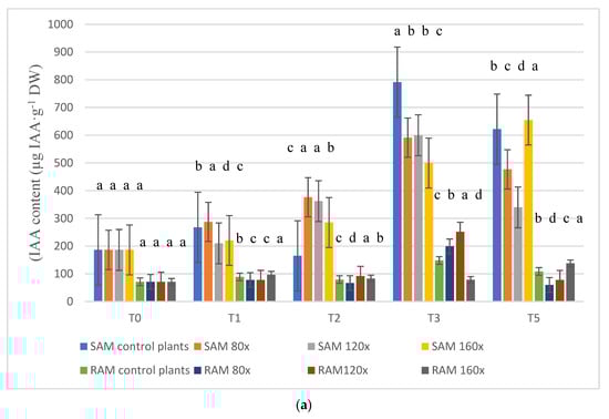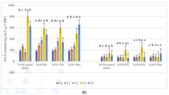 In RAM (root apical meristem), IAA content varied in plants regardless of MS length as well as stress intensity (Figure 2a,b). On T0, T1, and T2, there were no significant differences between IAA content in control and plants subjected to MS. On T3, IAA content in plants stroked 80 and 120 times per day was significantly higher than in control plants and those stroked 160 times per day. The highest IAA content in control plants and those stroked 80 and 120 times per day, in SAM and RAM, was observed on T3 (Figure 2b).