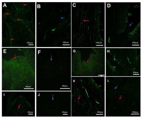 Auxin influx (LAX1 and AUX1) and efflux (PIN1) carriers immunoanalysis in stems of control (A,B,E,F,I,J) and stroked 160 times per day (C,D,G,H,K,L) plants. Red arrows present LAX1, AUX1, and PIN1 antibody signals in SAM buds and provascular strands of the main stem (A,C,E,G,I,K) and no signal (blue arrow) in the axillary bud (B,D,F,H,J,L).