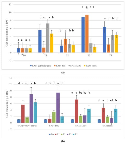 (a) Gibberellic acid (GA3) content (ng·g−1 DW) in the apical meristem of stems [SAM], analyzed separately, of petunias subjected to MS depending on stress intensity. The specimen was collected from 15 plants in each block from each treatment in each of the five terms (α = 0.05). (b) Gibberellic acid (GA3) content (ng·g−1 DW) in the apical meristem of stems [SAM], analyzed separately, of petunias subjected to MS depending on stress duration. The specimen was collected from 15 plants in each block from each treatment in each of the five terms (α − 0.05). The lowercase letters present statistical differences (α − 0.05) between the treatments.