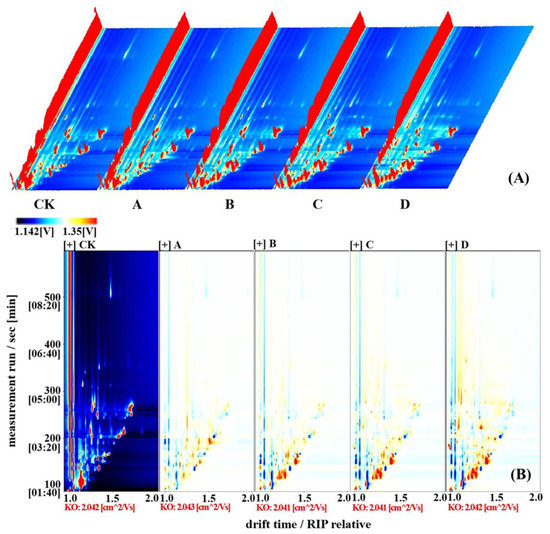 Topographic plot of pomegranate seeds at different processing temperatures. (A) 3D topographic plots of VOCs in pomegranate seeds at different processing temperatures; (B) 2D topographic plots of VOCs in pomegranate seeds at different processing temperatures (note: CK, A, B, C, and D represent raw pomegranate seeds, and pomegranate seeds processed at 140, 160, 180, and 200 °C, respectively. The same is the case below.).
