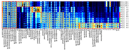In order to correctly assess the closely connected substances on the topographic plot, all the information given by the fingerprint analysis technique was used for qualitative characterization. In the fingerprint (Figure 2), each row shows all the signal peaks of a sample, and each column shows the same volatile compound in different samples. Additionally, its color represents the content of volatile compounds, with a brighter color indicating higher content. As shown in Figure 2, the contents of volatile organic compounds were very different in the samples of each group. A total of 70 VOCs were displayed, of which 54 VOCs were clearly identified; these are named after compounds, and the unidentified VOCs are represented by the numbers 1–16. Identified compounds were divided into five categories, comprising 17 aldehydes, 16 esters, 8 ketones, 7 alcohols, and 6 other compounds, shown in Table 1. Fourteen compounds produced two signals with different intensities due to differences in concentration or proton affinity, including benzaldehyde, (E,E)-2,4-hexadienal, hexanal, furfural, butyl butyrate, butyl propionate, ethyl valerate, 2-methylbutanol acetate, 2-methylbutyl formate, ethyl propionate, 2-hexanone, (E)-3-pentene-2-one, and 1-hexanol.