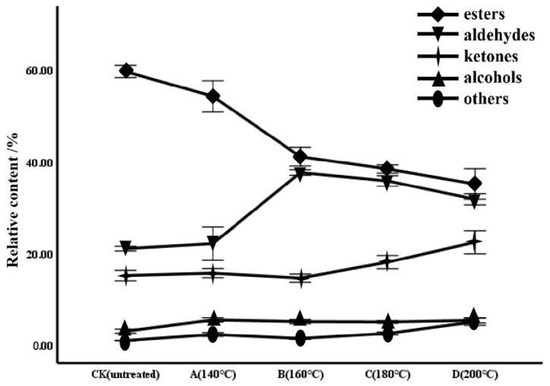 As shown in Table 1, the area normalization method was applied to calculate the relative content of each component with the peak volume of VOCs, and a clustering analysis was conducted. High contents of acetone, 2-methylbutyl formate (dimer), and ethyl valerate (dimer) were detected in all samples, which may contribute little to distinguishing the different aromas of processed pomegranate seeds. There were relatively high contents of ethyl acetate and hexanal (dimer) in group CK, ethyl valerate (monomer) and butyl propionate (dimer) in group A, and butyraldehyde and 2-methyl-1-butanal in groups B, C, and D. These may be the compounds that contribute to the aroma of each group. Moreover, with the rise in temperature, the esters showed a downward tendency, while the aldehydes showed an upward to downward tendency. Likewise, the change tendency of alcohols and other components is consistent with that of ketones, being inclined from upward to downward to upward, but this tendency is not significant, especially for alcohols. For details, see Figure 3.